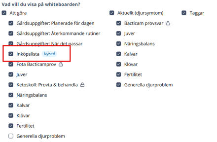 Glöm inte att spara dina inställningar för att visa inköpslistan på whiteboarden.